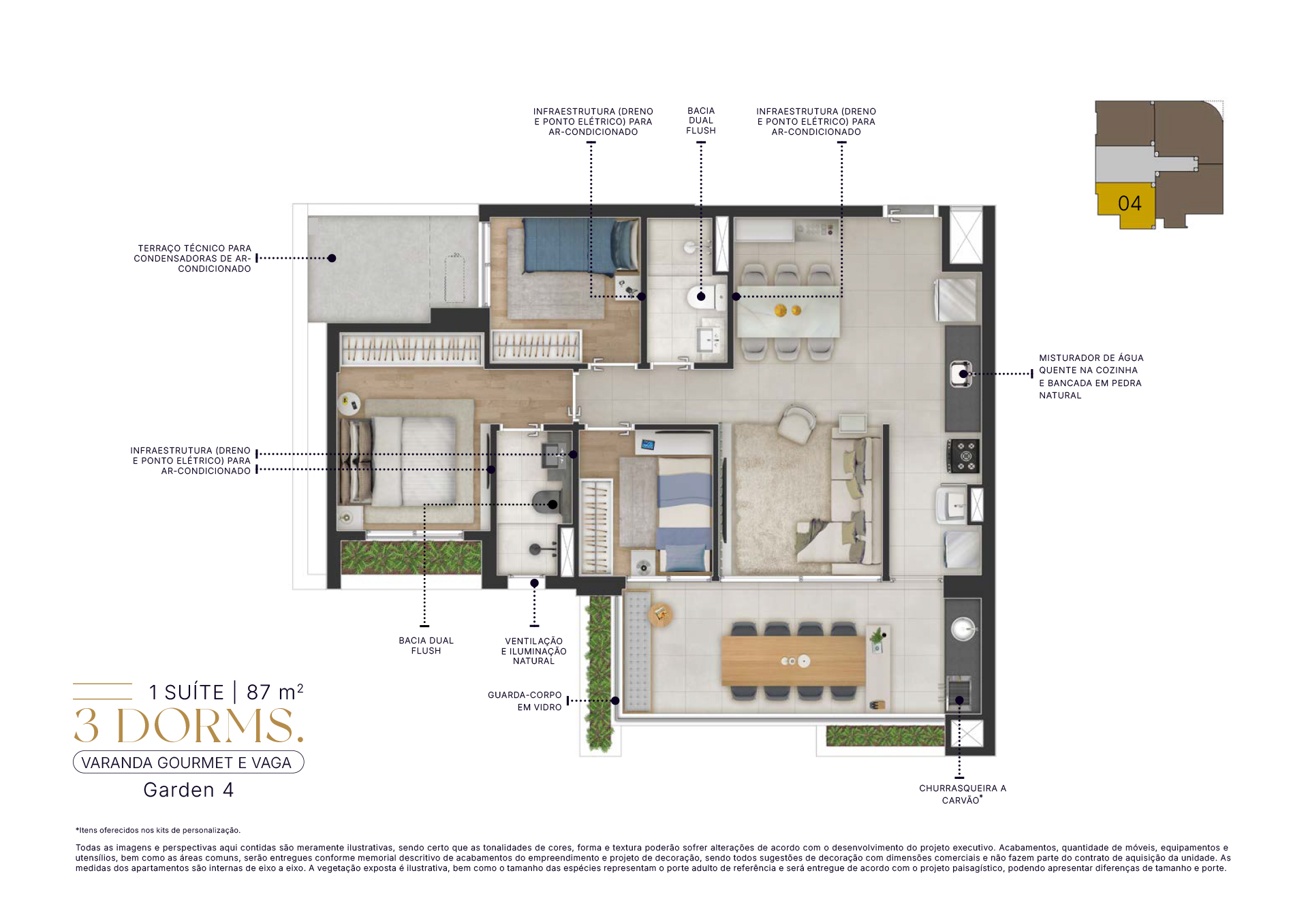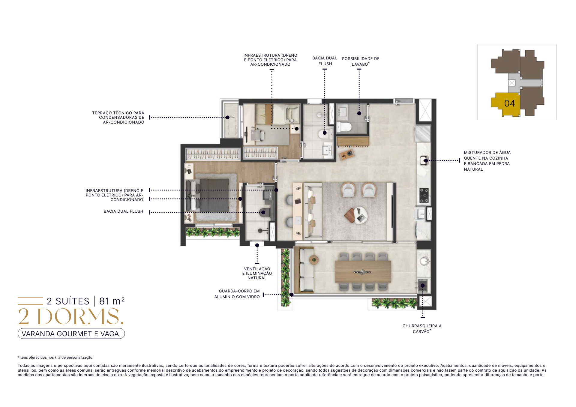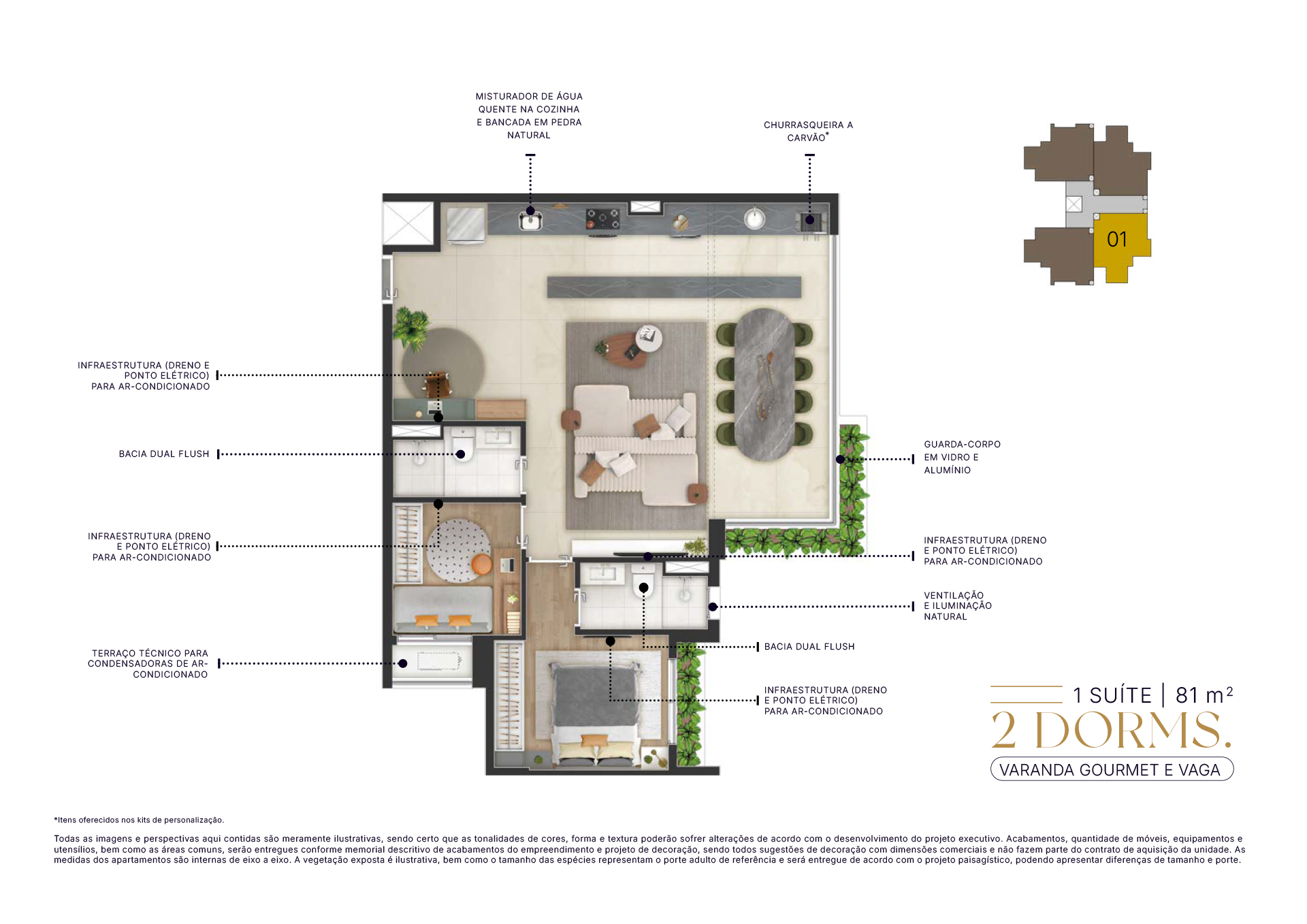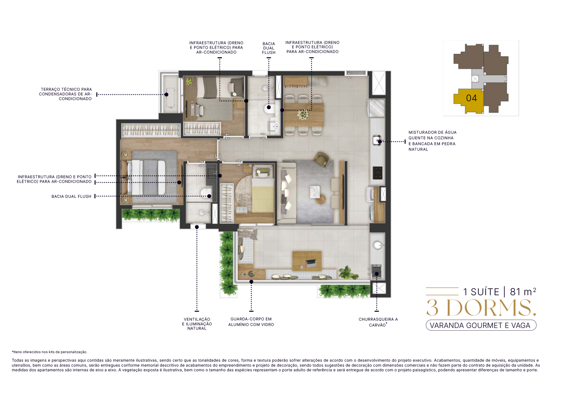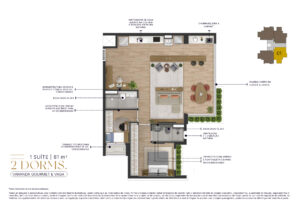 Todas as imagens e perspectivas aqui contidas são meramente ilustrativas, sendo certo que as tonalidades de cores, forma e textura poderão sofrer alterações de acordo com o desenvolvimento do projeto executivo. Acabamentos, quantidade de móveis, equipamentos e utensílios, serão entregues conforme memorial descritivo de acabamentos do empreendimento e projeto de decoração, sendo todos sugestões de decoração com dimensões comerciais e não fazem parte do contrato de aquisição da unidade. As medidas dos apartamentos são internas de eixo a eixo. A vegetação exposta é ilustrativa, bem como o tamanho das espécies representam o porte adulto de referência e será entregue de acordo com o projeto paisagístico, podendo apresentar diferenças de tamanho e porte.