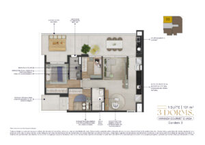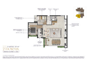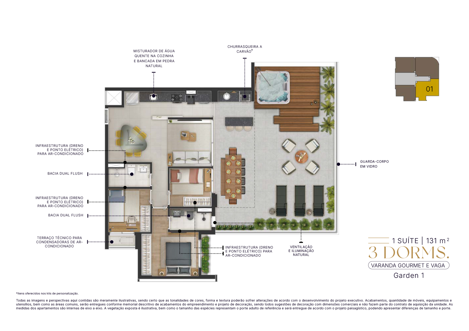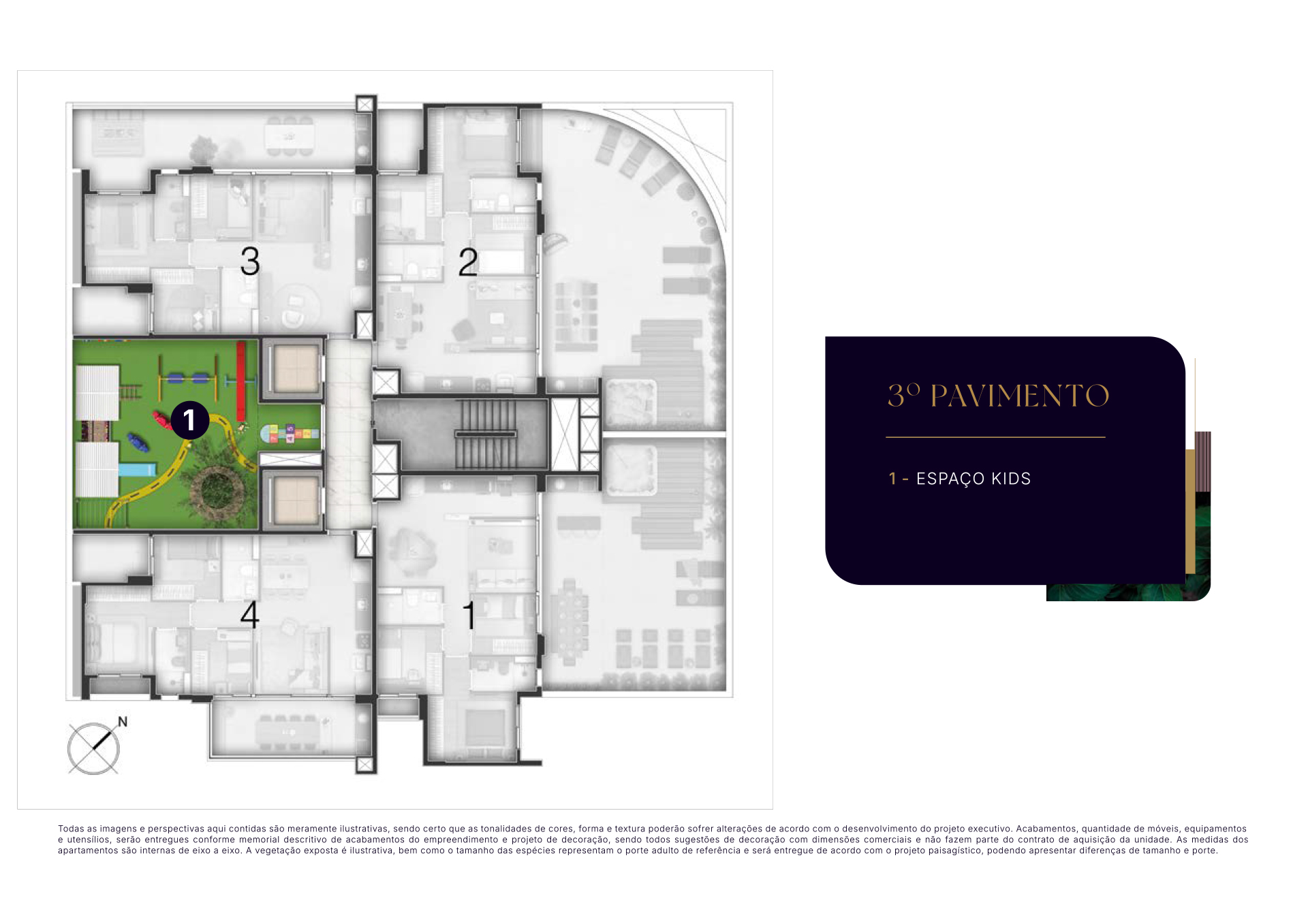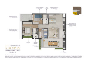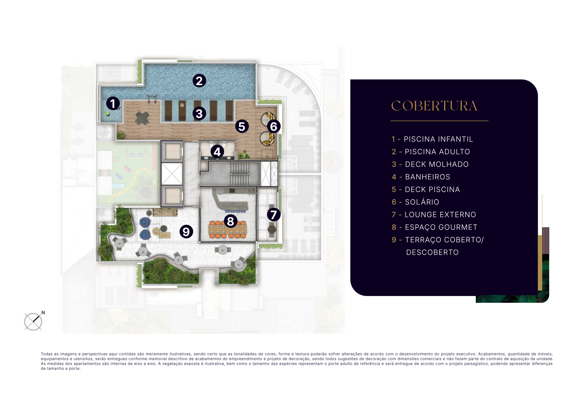 Todas as imagens e perspectivas aqui contidas são meramente ilustrativas, sendo certo que as tonalidades de cores, forma e textura poderão sofrer alterações de acordo com o desenvolvimento do projeto executivo. Acabamentos, quantidade de móveis, equipamentos e utensílios, serão entregues conforme memorial descritivo de acabamentos do empreendimento e projeto de decoração, sendo todos sugestões de decoração com dimensões comerciais e não fazem parte do contrato de aquisição da unidade. As medidas dos apartamentos são internas de eixo a eixo. A vegetação exposta é ilustrativa, bem como o tamanho das espécies representam o porte adulto de referência e será entregue de acordo com o projeto paisagístico, podendo apresentar diferenças de tamanho e porte.