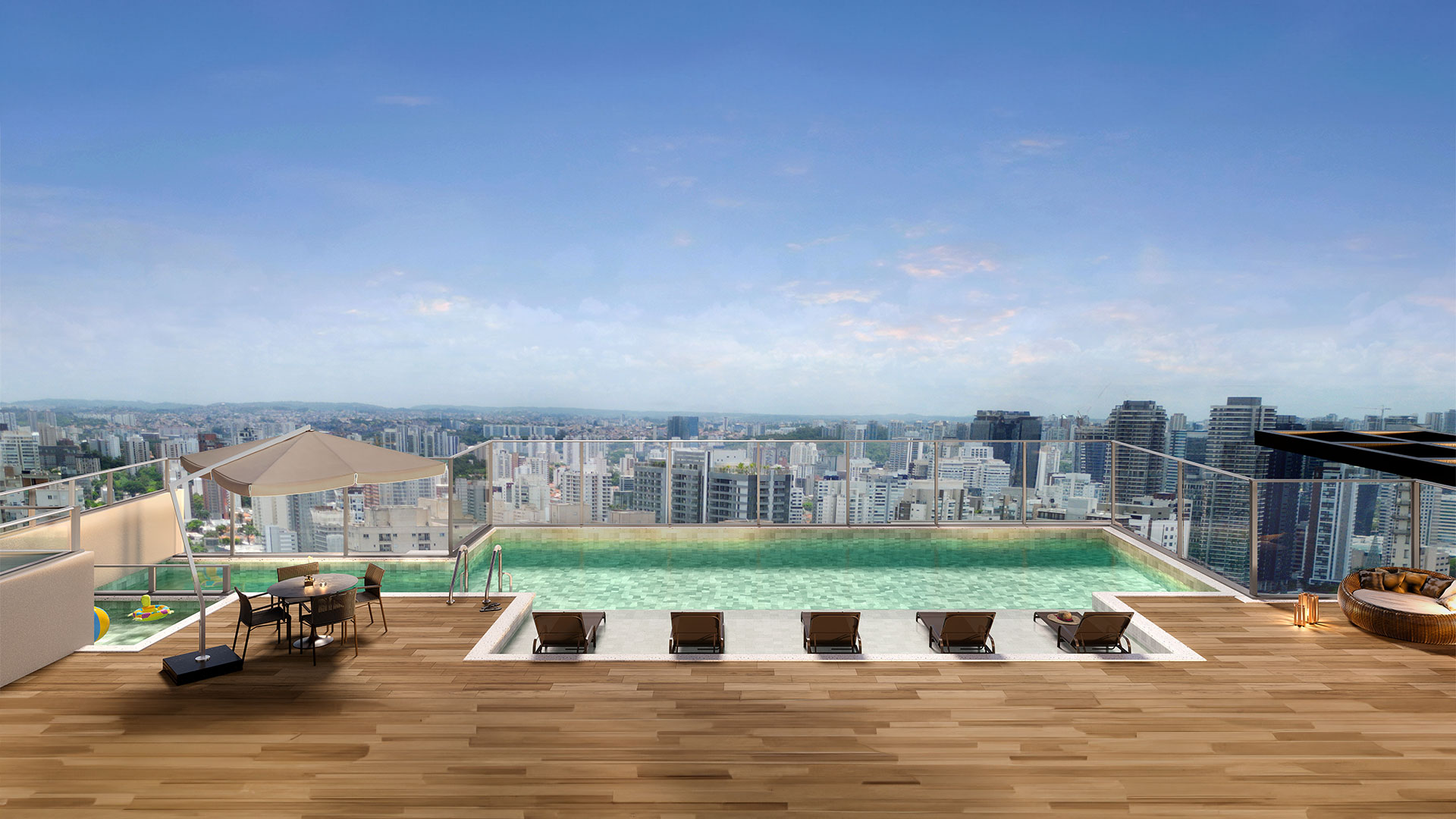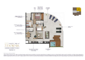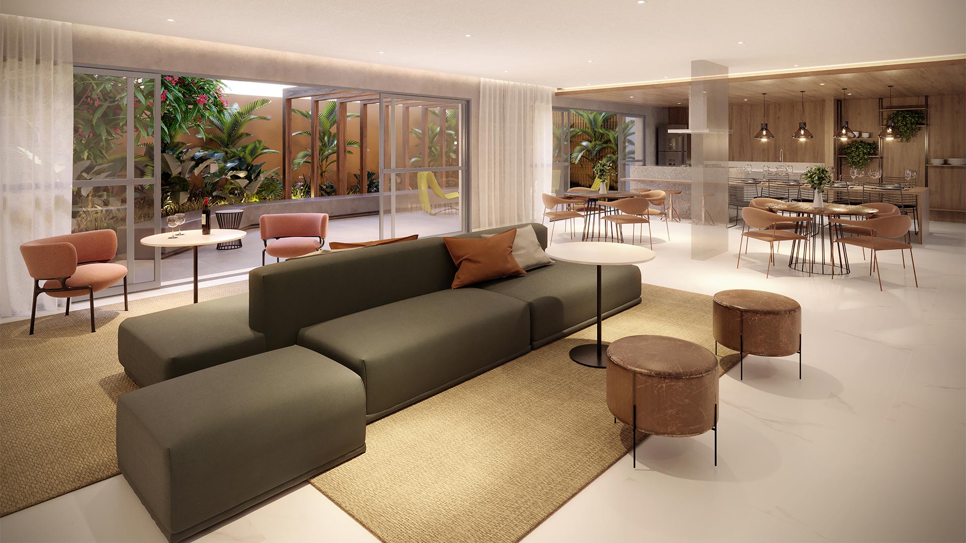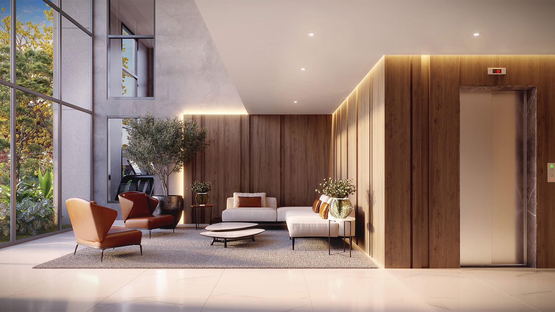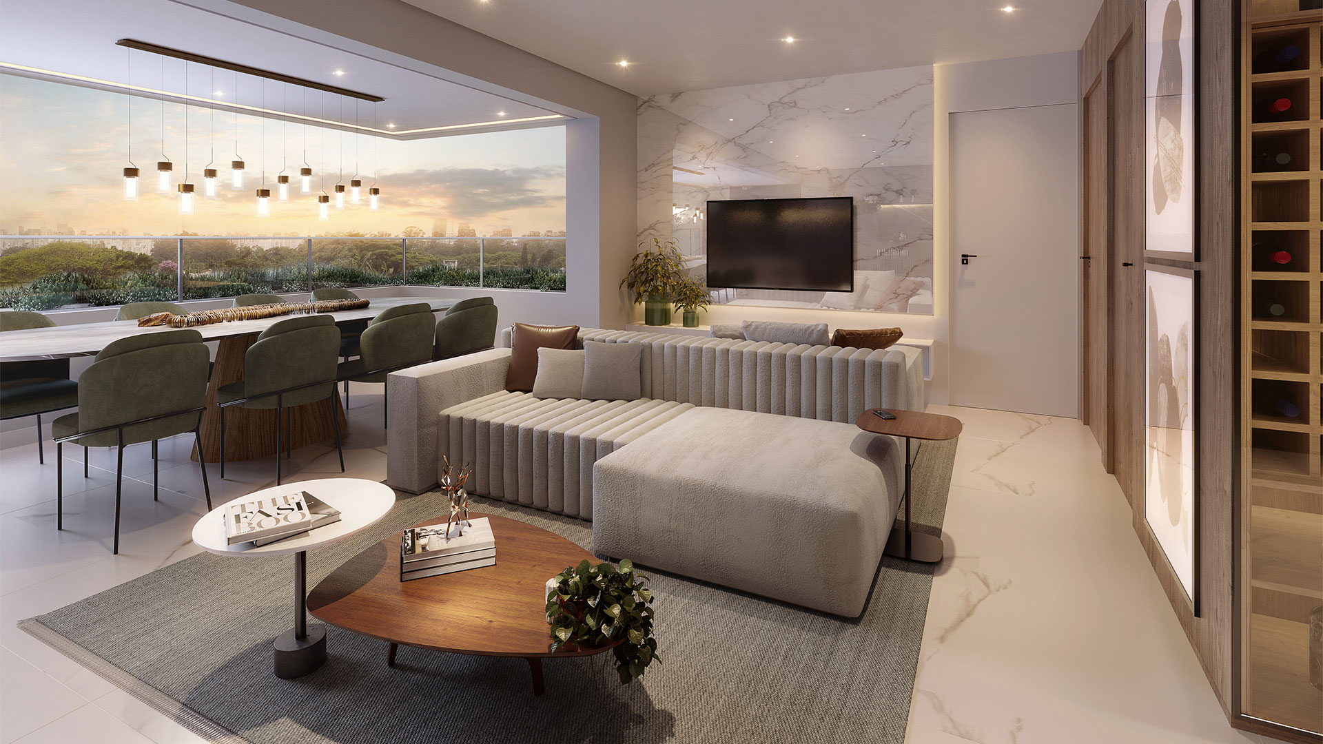 Todas as imagens e perspectivas aqui contidas são meramente ilustrativas, sendo certo que as tonalidades de cores, forma e textura poderão sofrer alterações de acordo com o desenvolvimento do projeto executivo. Acabamentos, quantidade de móveis, equipamentos e utensílios, serão entregues conforme memorial descritivo de acabamentos do empreendimento e projeto de decoração, sendo todos sugestões de decoração com dimensões comerciais e não fazem parte do contrato de aquisição da unidade. As medidas dos apartamentos são internas de eixo a eixo. A vegetação exposta é ilustrativa, bem como o tamanho das espécies representam o porte adulto de referência e será entregue de acordo com o projeto paisagístico, podendo apresentar diferenças de tamanho e porte.