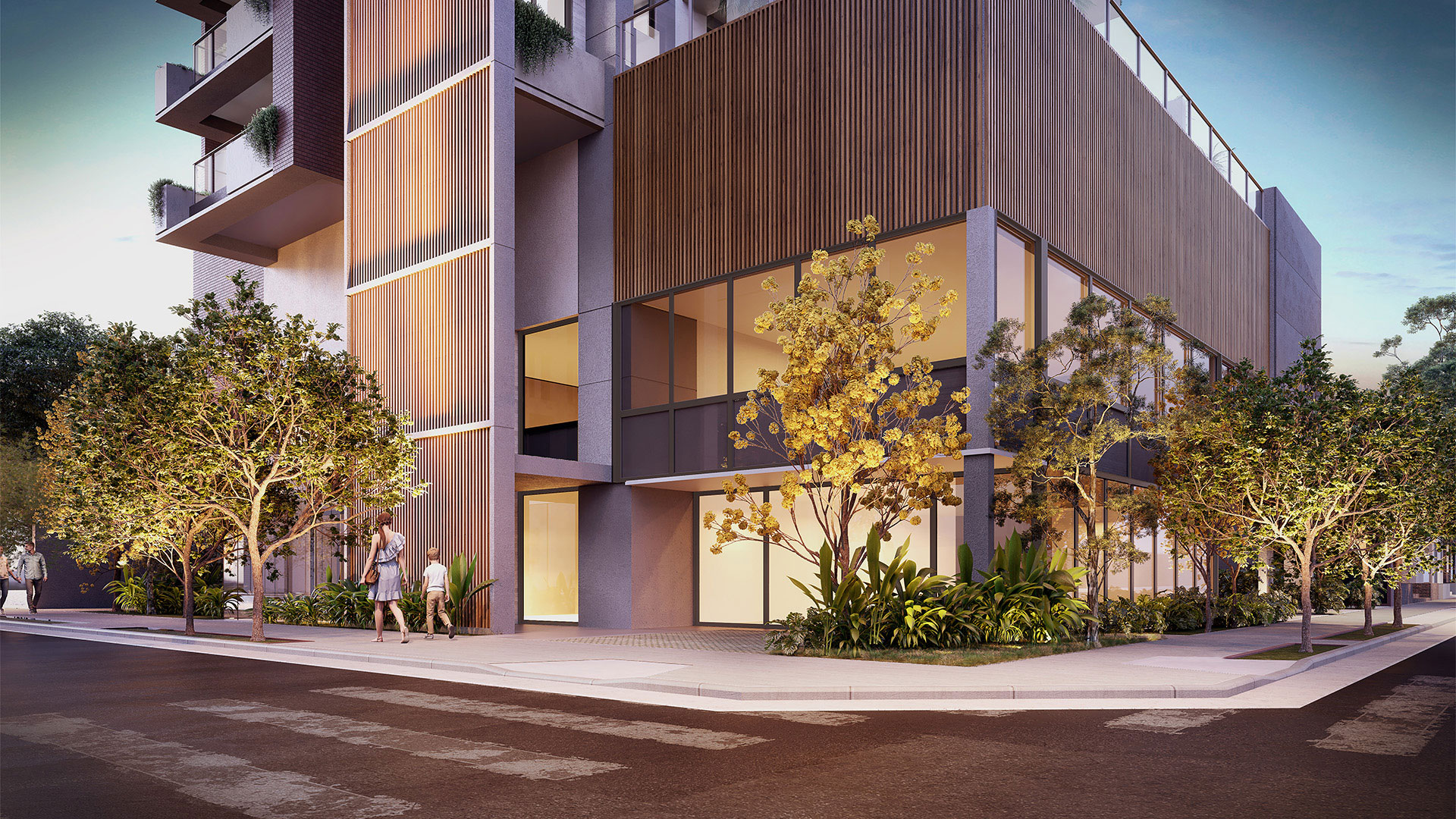 Fachada com brise amadeirado em alumínio, massa texturizada e revestimento da Portobello